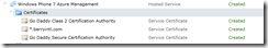 Make sure to check in the two files from GoDaddy, the *.pfx file from the Certificate Manager, and a text file containing the password used with the *.pfx file. Also check in the Windows Azure Service Definition files in the Azure Project node, the REST Method code files, and the WP7 app code files.[*Granted storing the certificate and the password in the same place creates a security risk. At this point, I think you understand they are dependent on each other and one is useless without the other. Please follow your own organization’s guidelines for securing such files.]